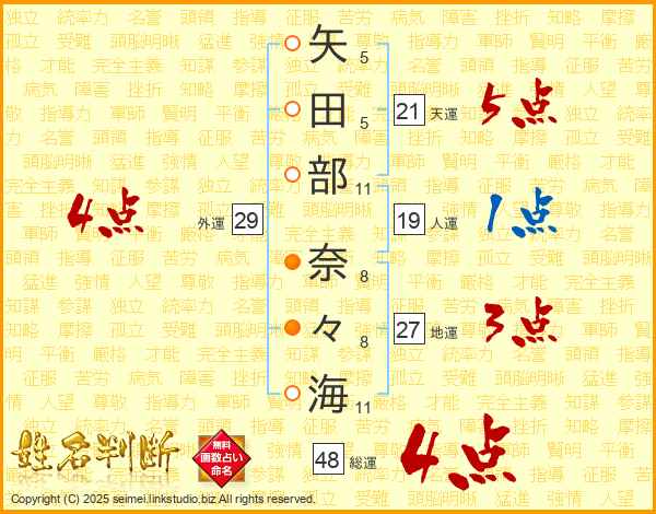 矢(5画)田(5画)部(11画) 奈(8画)々(8画)海(11画)