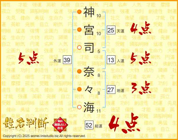 神(10画)宮(10画)司(5画) 奈(8画)々(8画)海(11画)