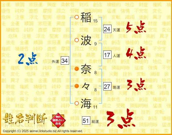 稲(15画)波(9画) 奈(8画)々(8画)海(11画)