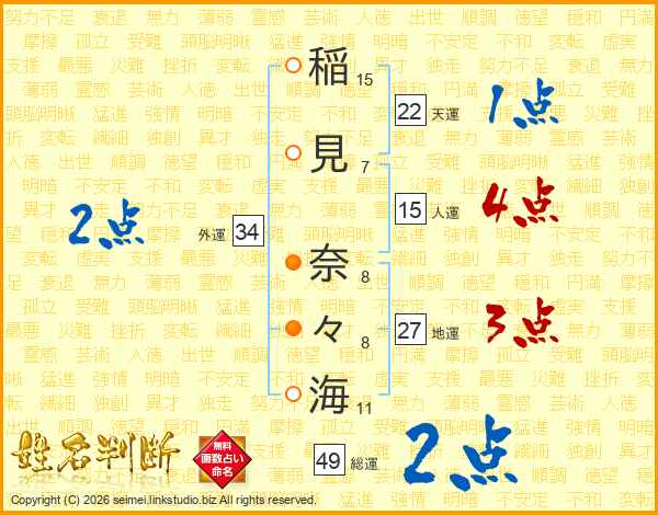稲(15画)見(7画) 奈(8画)々(8画)海(11画)