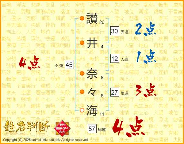 讃(26画)井(4画) 奈(8画)々(8画)海(11画)