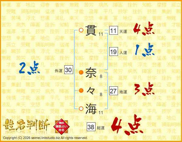 生活面を象徴する運勢です。外部から受ける影響力を表し、結婚運、家庭運や職場、環境への順応性を表します。総運から人運を引いた画数。姓や名が1文字の場合を除く。