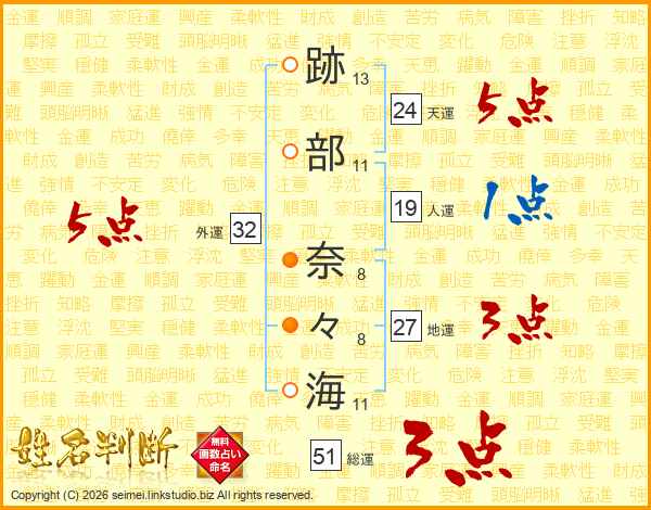 跡(13画)部(11画) 奈(8画)々(8画)海(11画)