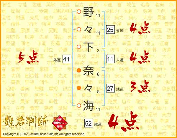 野(11画)々(11画)下(3画) 奈(8画)々(8画)海(11画)