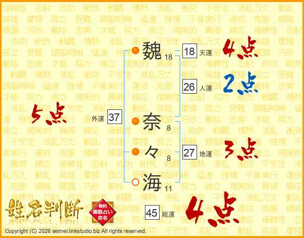 魏(18画) 奈(8画)々(8画)海(11画)