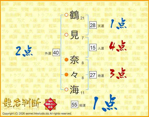 鶴(21画)見(7画) 奈(8画)々(8画)海(11画)