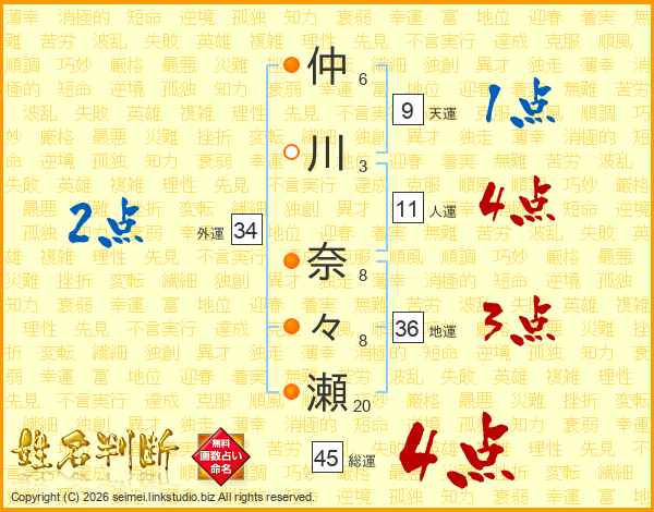 仲(6画)川(3画) 奈(8画)々(8画)瀬(20画)
