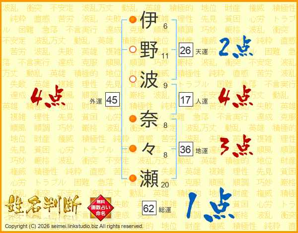 伊(6画)野(11画)波(9画) 奈(8画)々(8画)瀬(20画)