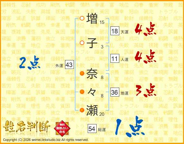 増(15画)子(3画) 奈(8画)々(8画)瀬(20画)