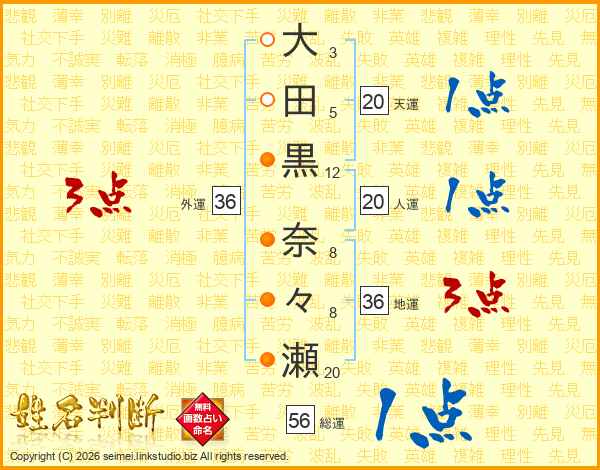 大(3画)田(5画)黒(12画) 奈(8画)々(8画)瀬(20画)