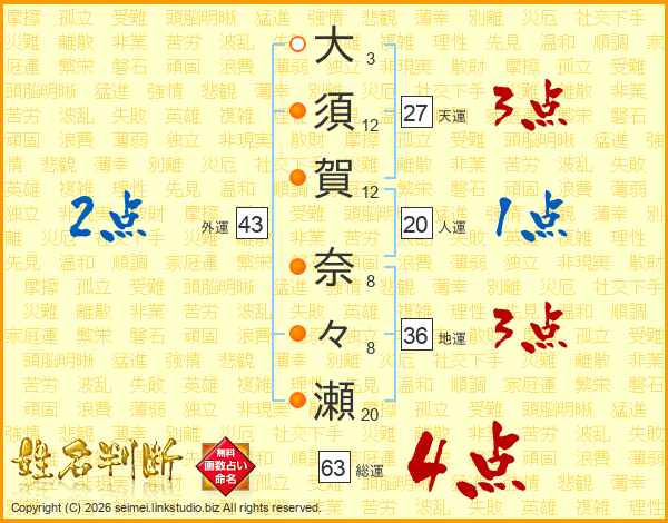 大(3画)須(12画)賀(12画) 奈(8画)々(8画)瀬(20画)