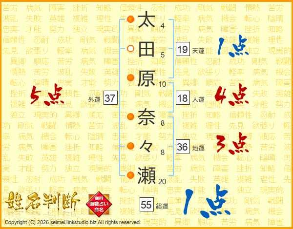 太(4画)田(5画)原(10画) 奈(8画)々(8画)瀬(20画)