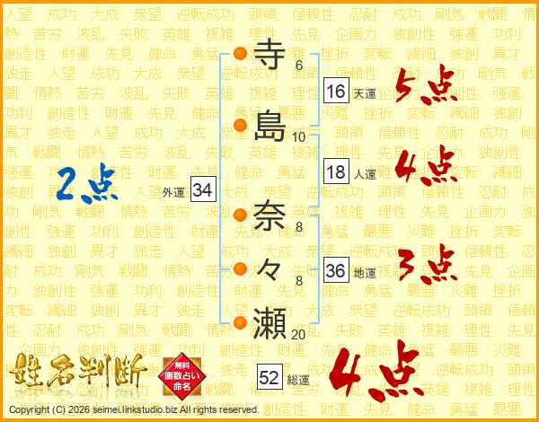 寺(6画)島(10画) 奈(8画)々(8画)瀬(20画)