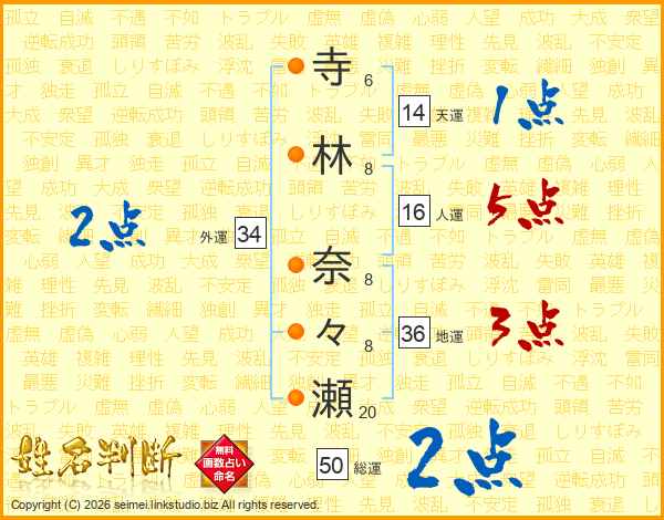 寺(6画)林(8画) 奈(8画)々(8画)瀬(20画)