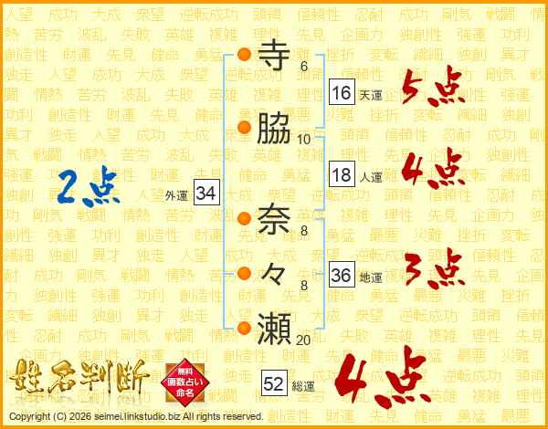 寺(6画)脇(10画) 奈(8画)々(8画)瀬(20画)