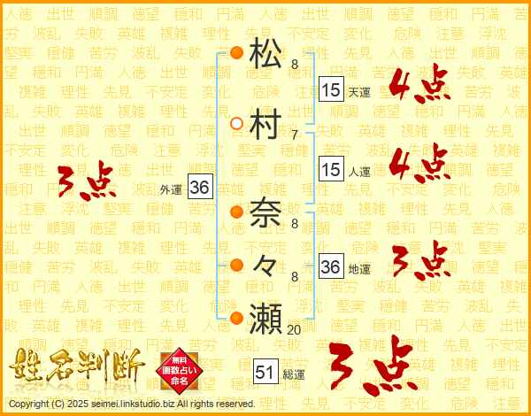松(8画)村(7画) 奈(8画)々(8画)瀬(20画)