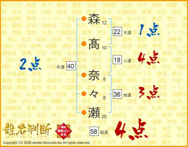 森髙奈々瀬さんの総運は58画の4点!