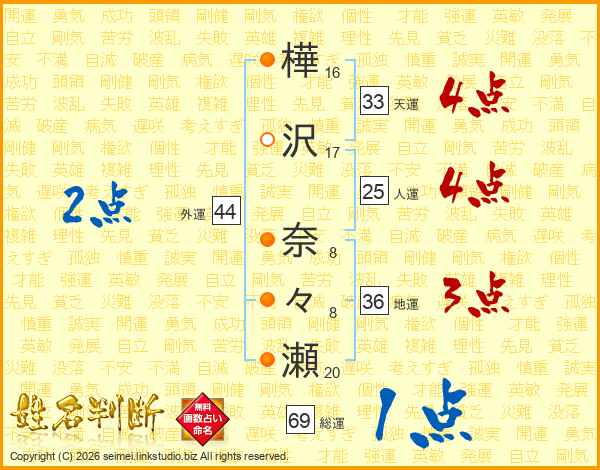 樺(16画)沢(17画) 奈(8画)々(8画)瀬(20画)