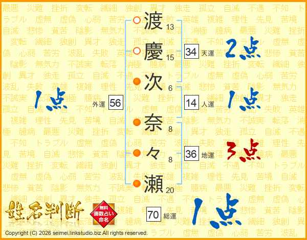 渡(13画)慶(15画)次(6画) 奈(8画)々(8画)瀬(20画)