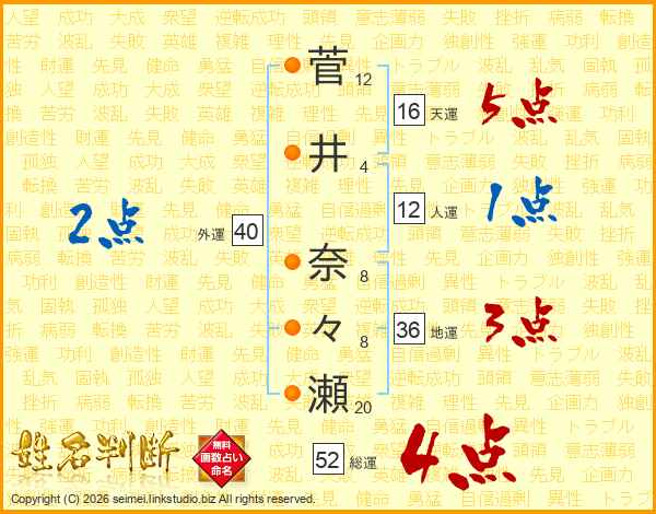 菅(12画)井(4画) 奈(8画)々(8画)瀬(20画)