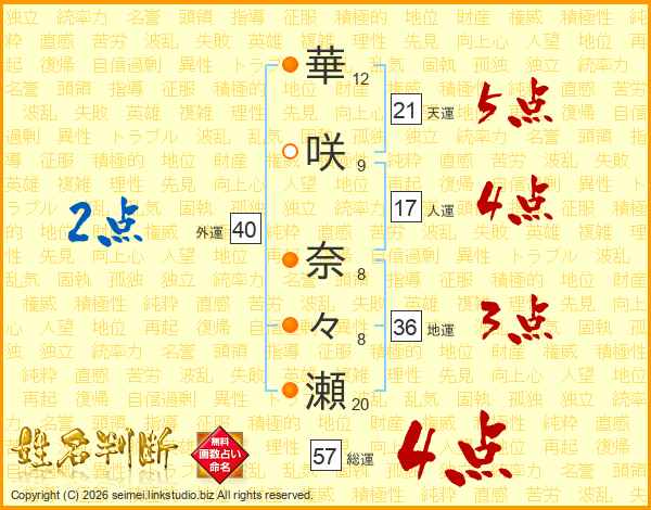 華(12画)咲(9画) 奈(8画)々(8画)瀬(20画)