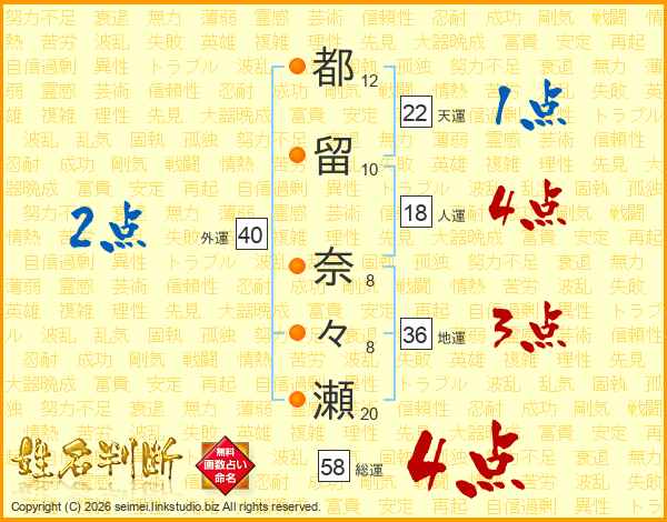 都(12画)留(10画) 奈(8画)々(8画)瀬(20画)