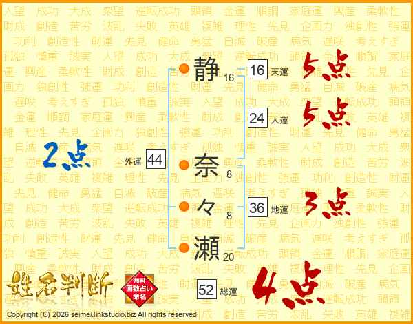 静(16画) 奈(8画)々(8画)瀬(20画)