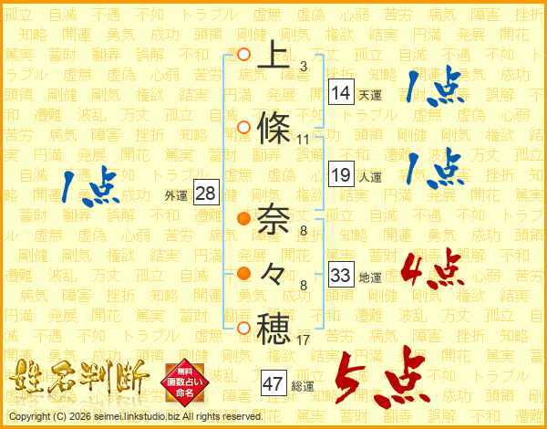 上(3画)條(11画) 奈(8画)々(8画)穂(17画)