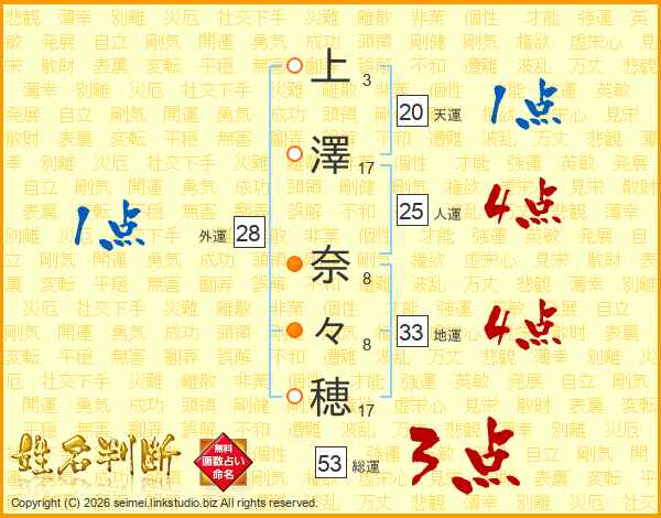 上(3画)澤(17画) 奈(8画)々(8画)穂(17画)