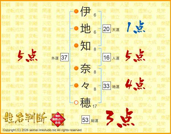 伊(6画)地(6画)知(8画) 奈(8画)々(8画)穂(17画)