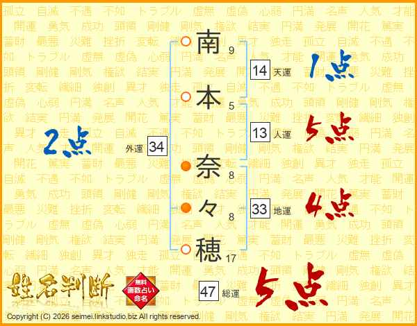 南(9画)本(5画) 奈(8画)々(8画)穂(17画)