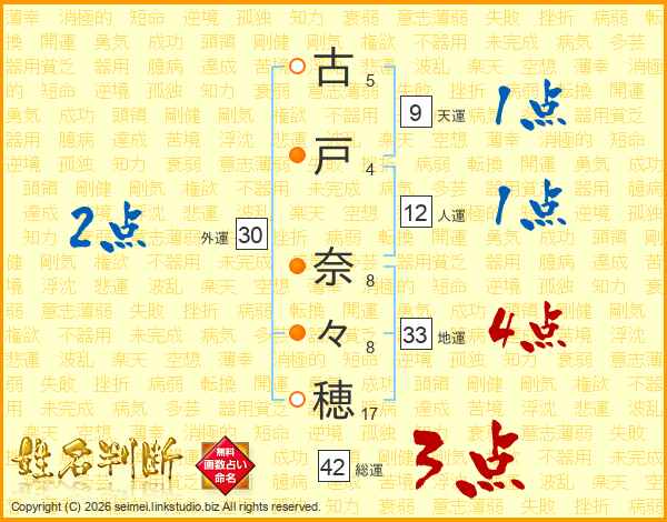 古(5画)戸(4画) 奈(8画)々(8画)穂(17画)