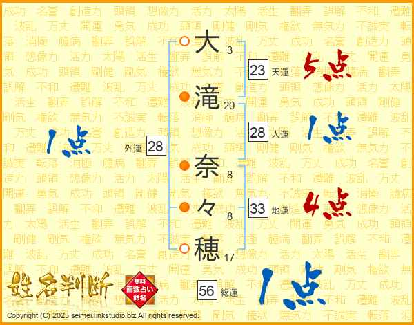 大(3画)滝(20画) 奈(8画)々(8画)穂(17画)