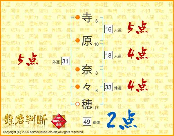 寺(6画)原(10画) 奈(8画)々(8画)穂(17画)