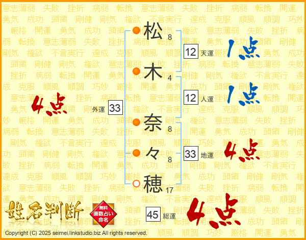 松(8画)木(4画) 奈(8画)々(8画)穂(17画)