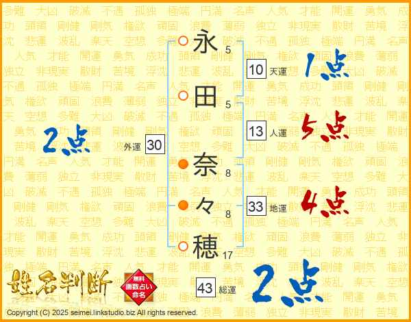 永(5画)田(5画) 奈(8画)々(8画)穂(17画)