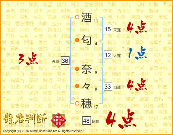 酒(11画)匂(4画) 奈(8画)々(8画)穂(17画)