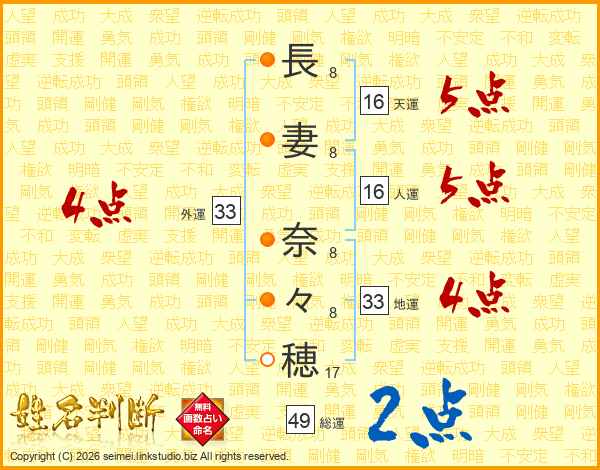 長(8画)妻(8画) 奈(8画)々(8画)穂(17画)