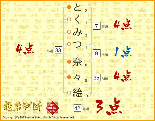 と(2画)く(1画)み(3画)つ(1画) 奈(8画)々(8画)絵(19画)