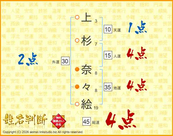 上(3画)杉(7画) 奈(8画)々(8画)絵(19画)