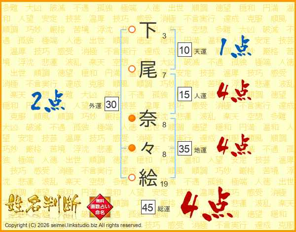 下(3画)尾(7画) 奈(8画)々(8画)絵(19画)