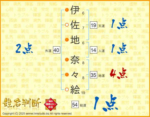 伊(6画)佐(7画)地(6画) 奈(8画)々(8画)絵(19画)