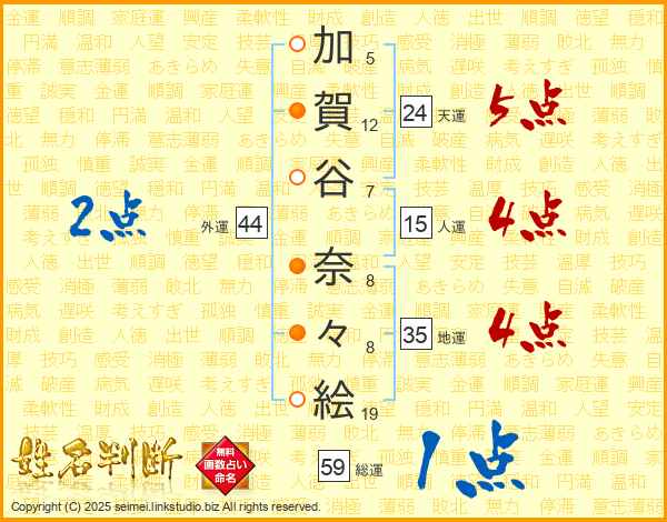 加(5画)賀(12画)谷(7画) 奈(8画)々(8画)絵(19画)