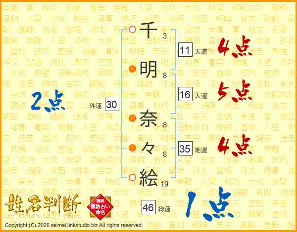 千(3画)明(8画) 奈(8画)々(8画)絵(19画)