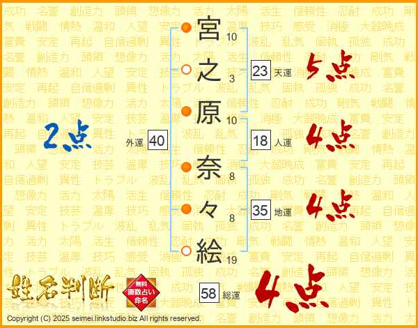 宮(10画)之(3画)原(10画) 奈(8画)々(8画)絵(19画)