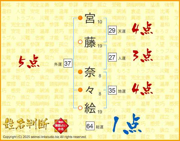 宮(10画)藤(19画) 奈(8画)々(8画)絵(19画)
