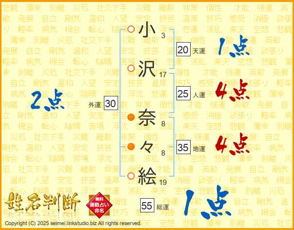 小(3画)沢(17画) 奈(8画)々(8画)絵(19画)