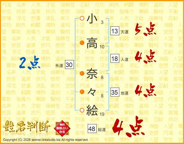 小(3画)高(10画) 奈(8画)々(8画)絵(19画)