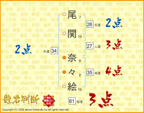 尾(7画)関(19画) 奈(8画)々(8画)絵(19画)