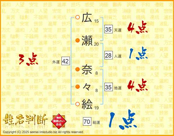 広(15画)瀬(20画) 奈(8画)々(8画)絵(19画)